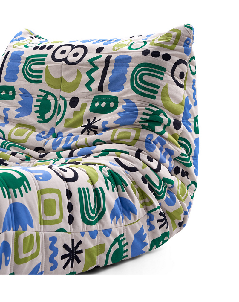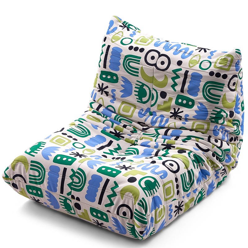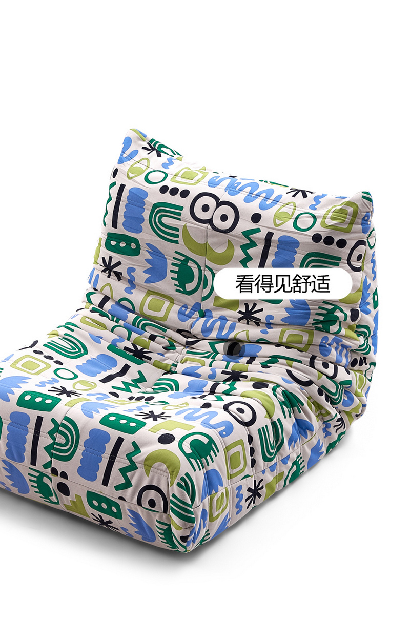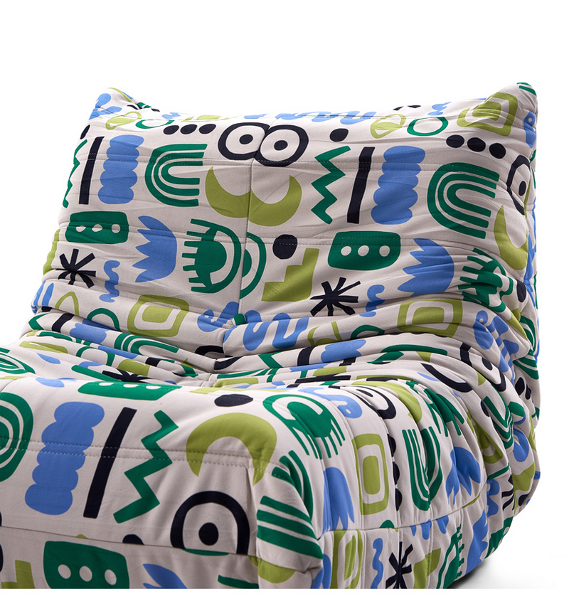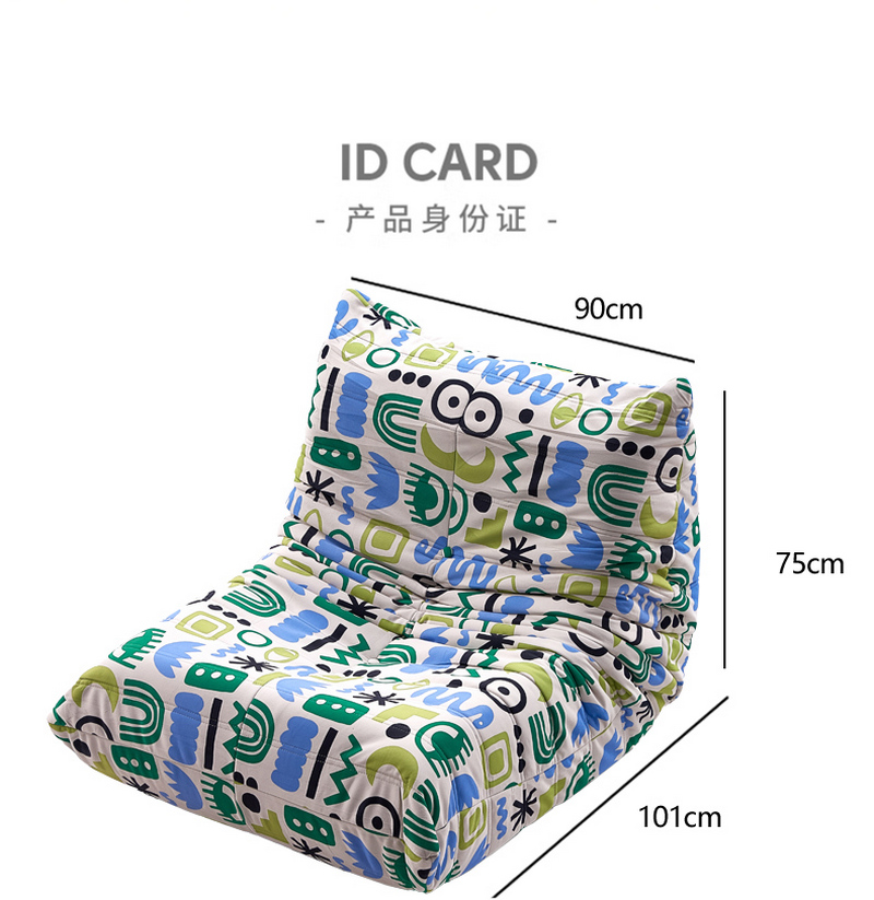 A vibrant compression lazy sofa featuring bold Memphis-style geometric patterns, combining playful color blocks with ergonomic low-center-of-gravity design. Filled with pressure-resistant polymer sponge and wrapped in durable gradient knit fabric, it delivers long-lasting comfort and style—perfect for small spaces and cross-border e-commerce.